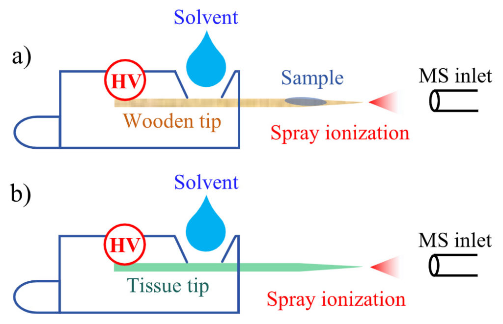 图1. 基于不同基底尖端的微型质谱直接电喷雾电离示意图:(a) 木质尖端;(b) 植物组织尖端