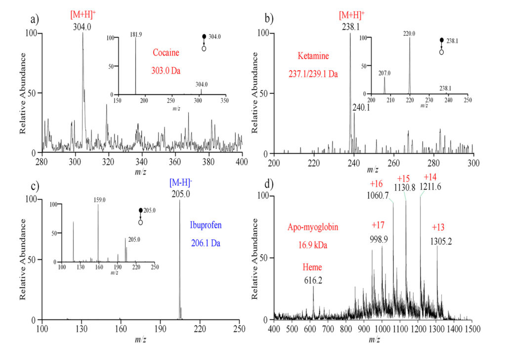 图2. 采用木质尖端电喷雾电离微型质谱法直接检测标准品:(a) 可卡因;(b) 氯胺酮;(c) 布洛芬;(d) 变性肌红蛋白