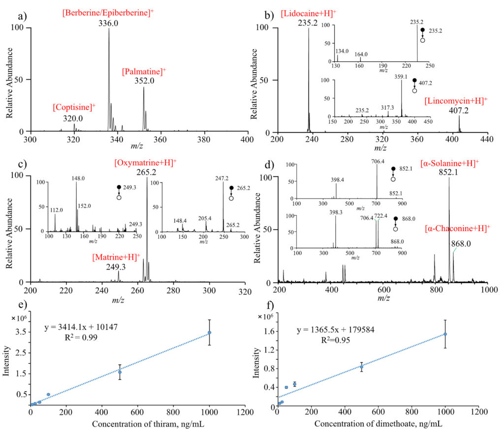 图3. 采用木质尖端电喷雾电离微型质谱法直接检测样品:(a)黄连提取物;(b)黏性林可霉素软膏;(c)苦参粉末;(d)发芽马铃薯;(e)福美双的定量检测;(f)乐果的定量检测