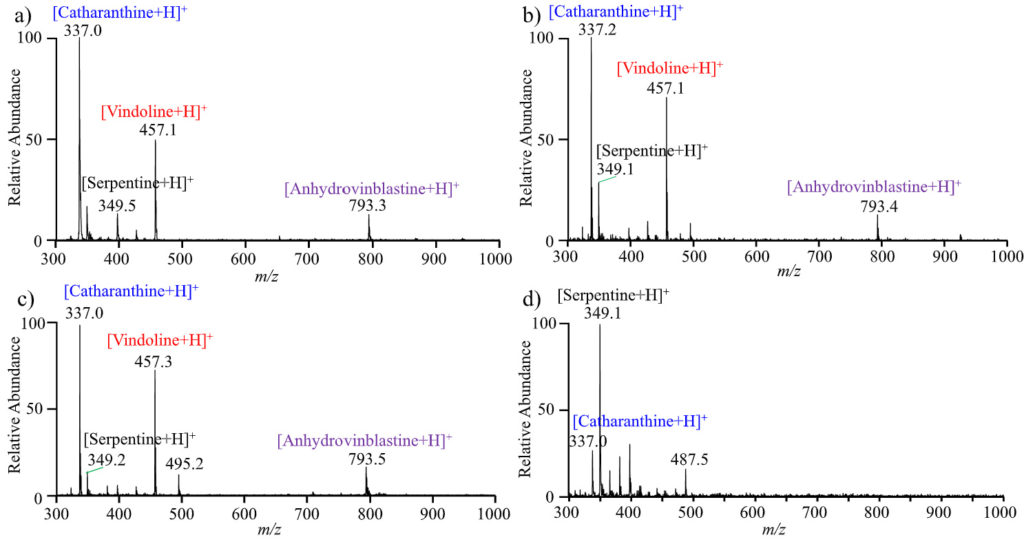 图4. 采用微型质谱直接分析不同部位长春花:(a) 花;(b) 叶;(c) 茎;(d) 根