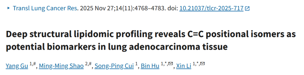 近日,首都医科大学附属北京朝阳医院胸外科胡滨、李欣团队在Translational Lung Cancer Research发表了题为“Deep structural lipidomic profiling reveals C=C positional isomers as potential biomarkers in lung adenocarcinoma tissue”的研究论文。该研究使用清谱科技Ω Analyzer脂质分析系统与液相色谱-质谱联用仪,首次在肺腺癌(LUAD)组织中完成深度结构脂质组学分析,揭示了碳碳双键(C=C)位置异构体在肺腺癌组织中的特异性改变,为肺腺癌的早期诊断和分子分型提供了新的潜在生物标志物。