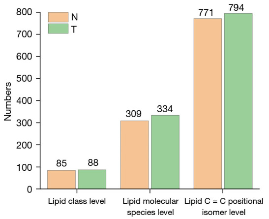 在三个层面上的鉴定结果显示,肺腺癌组织(T组)鉴定的脂质总数略高于正常肺组织(N组)。其中,在C=C位置异构体水平共精准鉴定出794种磷脂。磷脂酰乙醇胺(PE)类脂质中,T组各结构层面的鉴定数目均高于N组;磷脂酰胆碱(PC)类脂质两组鉴定数目无明显差异。两组在三个结构层面鉴定的脂质特征大部分重叠,仅少数低丰度脂质为各组特有。