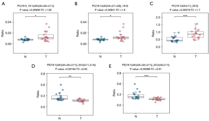 通过对C=C位置异构体的相对定量分析,研究发现肺腺癌组织中特定异构体比例发生显著且特异性的改变。图2展示了5种在C=C异构体水平存在显著差异的脂质分子,其中3种PC类脂质分子在T组中显著上调,表明去饱和或延长途径可能发生改变;而2种PE类脂质分子在T组中显著下调,提示脂质代谢或结构重塑可能发生偏移。