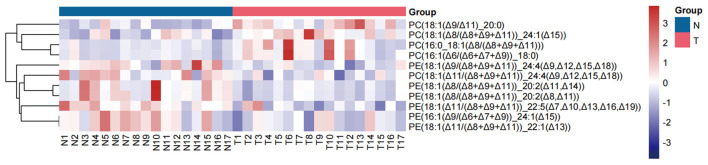 图 3. 正常肺组织与肺腺癌组织中脂质分子C=C位置异构体相对比率的层次聚类热图