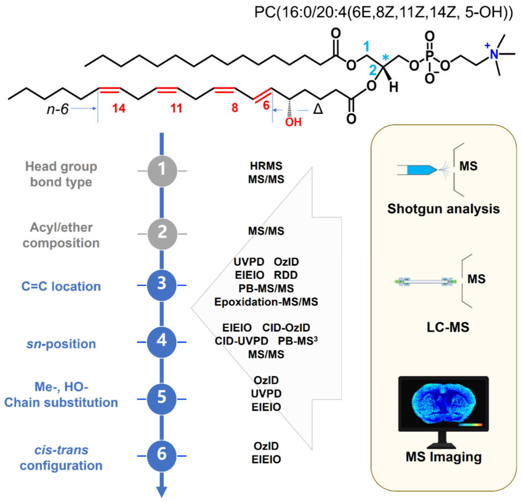 图 1. 磷脂酰胆碱分子(PC 16:0/20:4(6E,8Z,11Z,14Z,5-OH))的结构层次与不同结构水平脂质的质谱表征方法