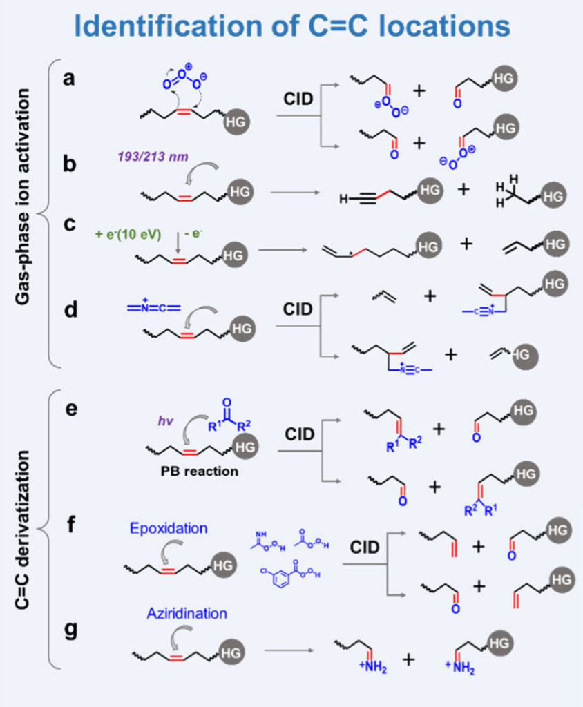 图 2. 鉴定脂质C=C位置的质谱方法:(a)OzID,(b)UVPD,(c)EIEIO,(d)CACI,(e)PB反应,(f)环氧化,(g)氮丙啶化