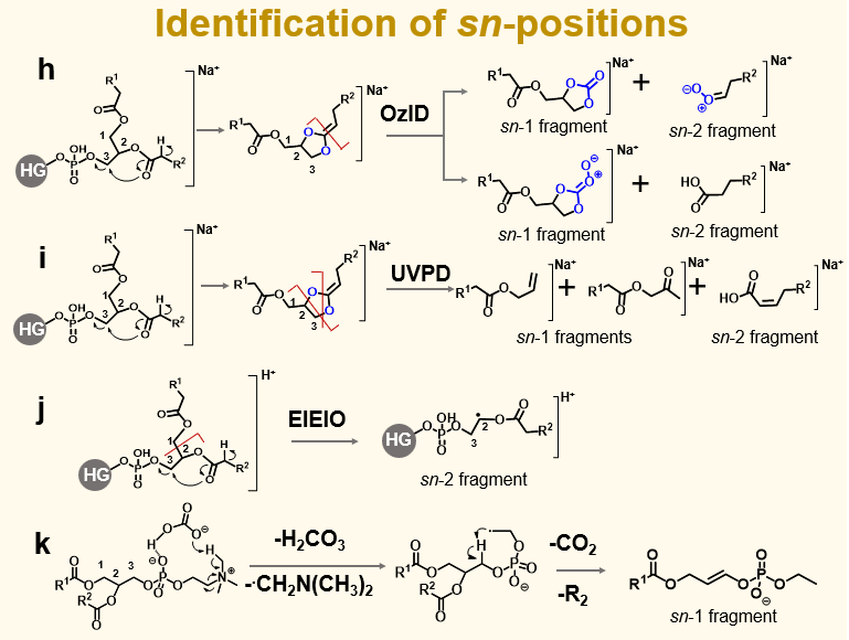 图 3. sn-位置鉴定方法:(h)MS³CID-OzID,(i)MS³CID-UVPD,(j)EIEIO,(k)PC或LPC([M+HCO₃]⁻)的MS²CID