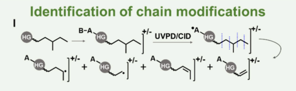 另一方面,基于自由基或电子的离子活化方法以及电荷远程碎裂技术,能够沿脂肪酰基链产生链内碎片,这些方法已被开发用于脂质链修饰的表征。例如,对经由电子轰击电离产生的饱和支链脂肪酸甲酯分子离子进行碰撞诱导解离,可根据产生的、对应于末端异丙基或甲基的产物离子,对支链结构进行可靠鉴定。