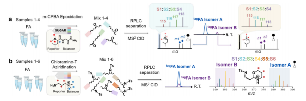 图 5. (a)采用SUGAR标签与m-CPBA环氧化反应对脂肪酸C=C位置异构体A与B(C=C键分别位于Δm和Δn位)进行定量分析与结构解析;(b)通过氯胺-T与甲苯磺酰基双重标记对脂肪酸C=C位置异构体A与B进行定量分析与结构解析的流程示意图
